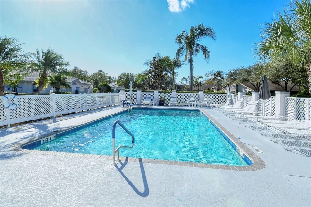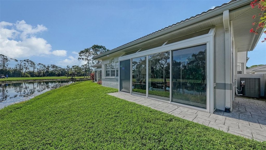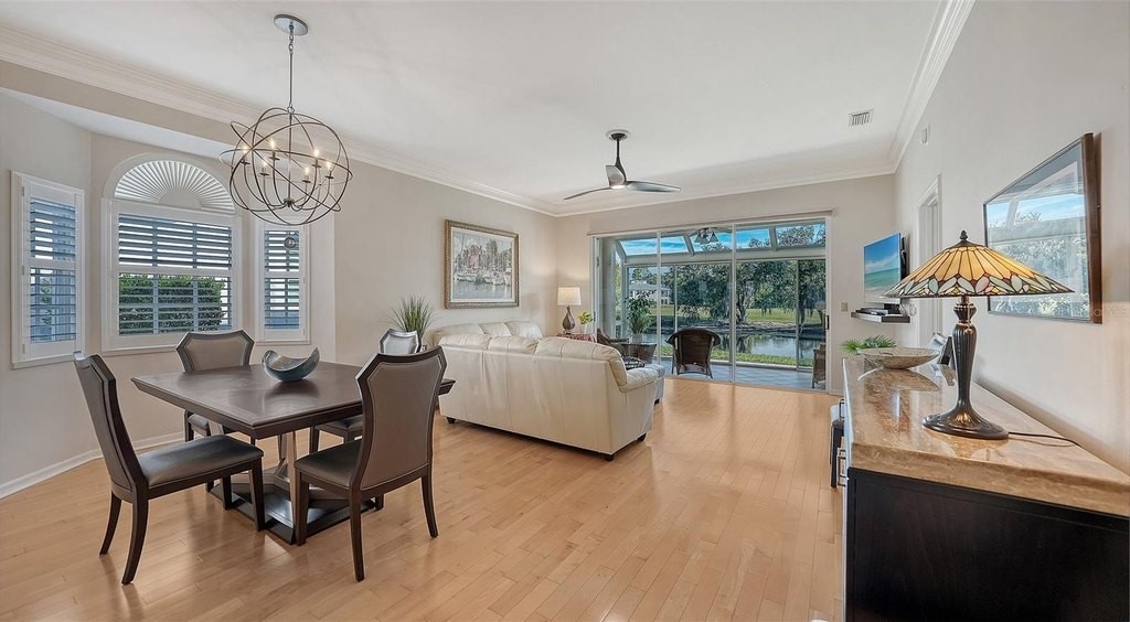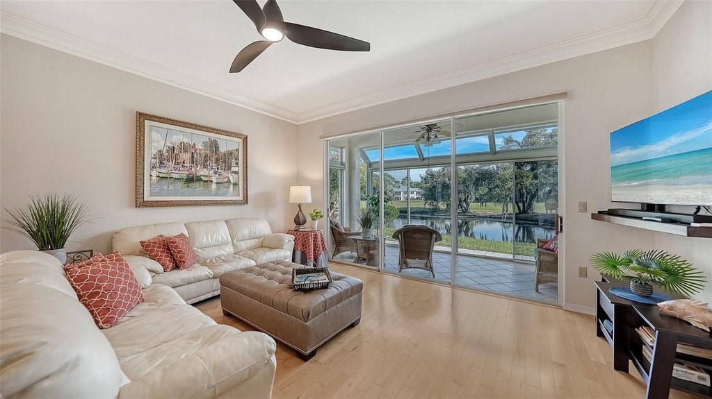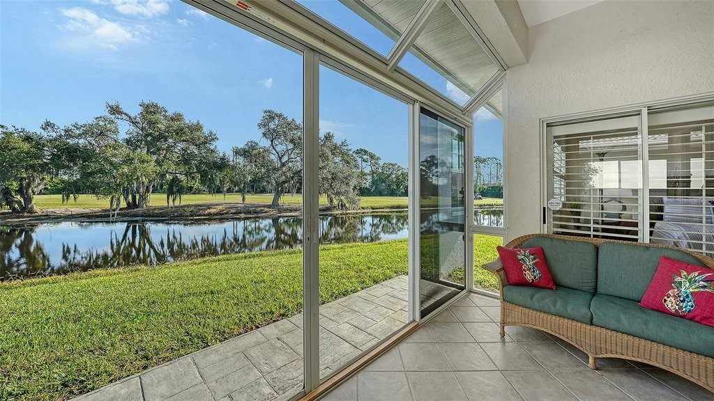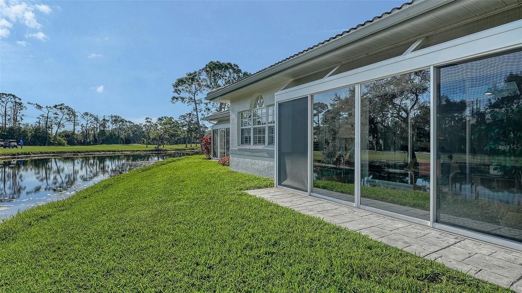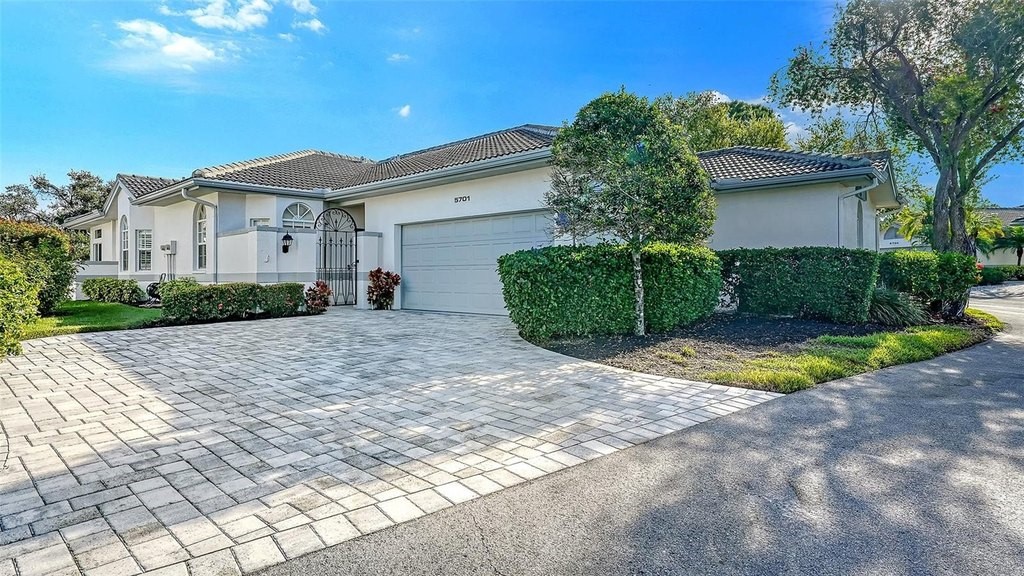 Inviting 2-bedroom, 2-bath villa offering the comfort of single-family living with the ease of a maintenance-free lifestyle. Thoughtfully designed and ideally positioned at the waters edge, this home features an extended glass-walled living space with peaceful lake and golf course views. A private gated courtyard, stone paver driveway and walkway, and two-car side-entry garage create a welcoming arrival. The bright and open layout is enhanced by 10-foot ceilings, crown molding, bay windows, plantation shutters, neutral finishes, and a combination of wood and tile flooring throughout. A spacious great room flows seamlessly into the eat-in kitchen, which offers 42-inch solid wood cabinetry, under-cabinet lighting, stainless steel appliances, breakfast bar to the dining area, and a built-in desk workspace. The primary suite features wood flooring, plantation shutters, sliding door to the lanai, and a private updated ensuite bath with dual sinks, floor-to-ceiling tiled walk-in shower with frameless glass and a linen closet. A well-appointed second bedroom providing comfortable accommodations for guests or a home office, complemented by a second full bathroom. Spacious laundry room with cabinetry, open shelving, newer washer & dryer and laundry tub. Being offered furnished (a few minor exclusions).Enjoy convenient access to the nearby community pool and all the amenities The Meadows has to offer. Golf, tennis, pickleball, lakes, walking trails, and mature landscaping. Ideally located just minutes from Benderson Park, UTC Mall, Whole Foods, Trader Joes, dining, shopping, and a short drive to Downtown Sarasota and the Gulf beaches. Delivering a well-balanced lifestyle in a highly desirable setting.