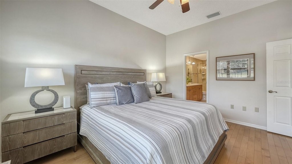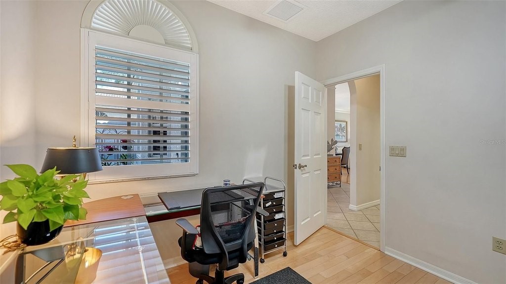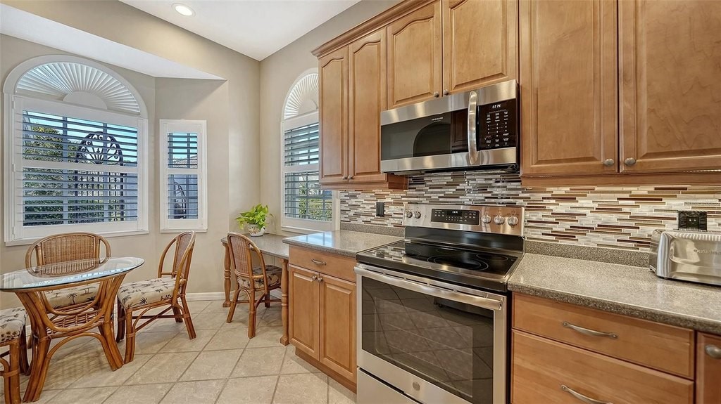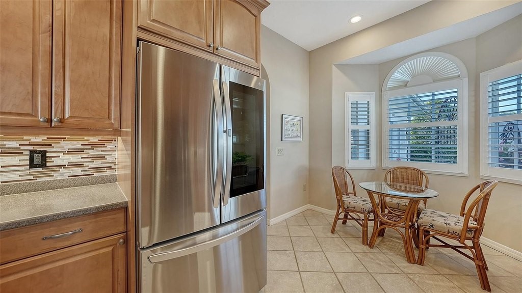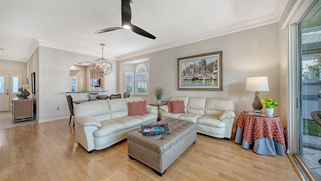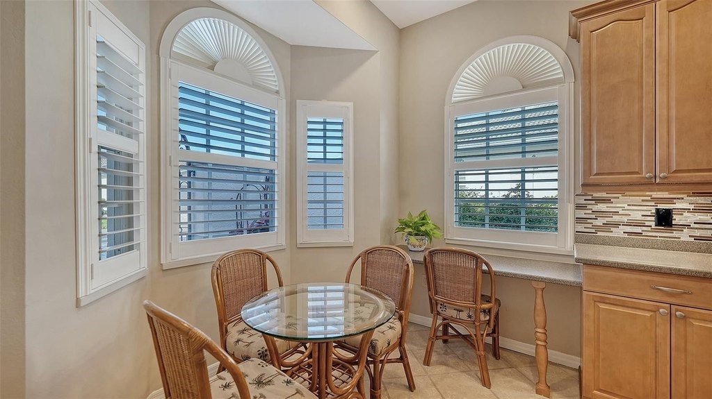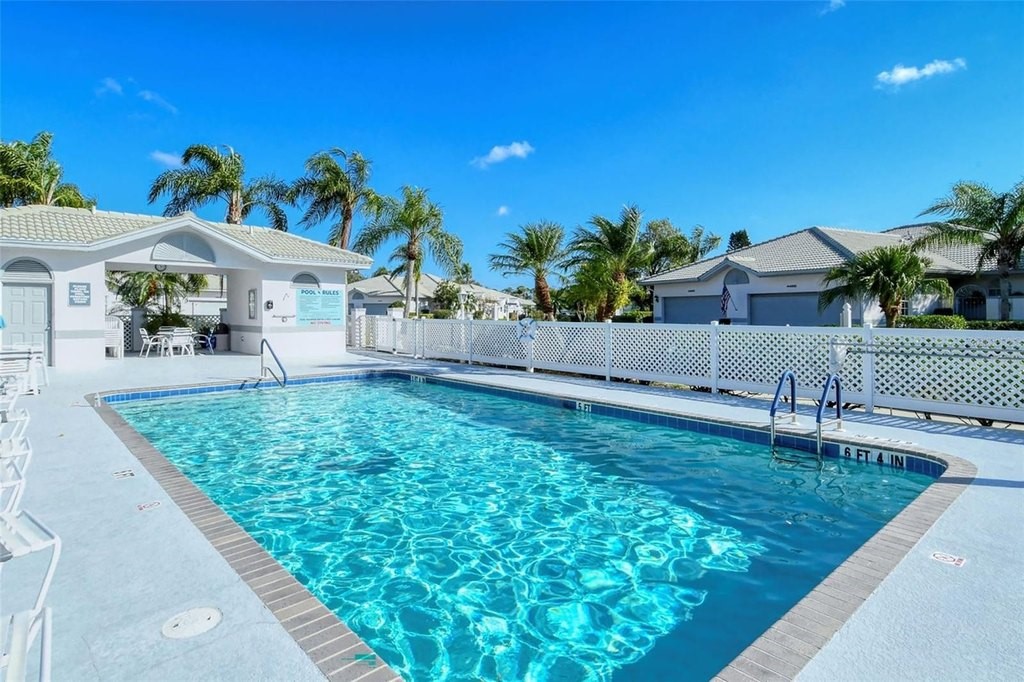 Inviting 2-bedroom, 2-bath villa offering the comfort of single-family living with the ease of a maintenance-free lifestyle. Thoughtfully designed and ideally positioned at the waters edge, this home features an extended glass-walled living space with peaceful lake and golf course views. A private gated courtyard, stone paver driveway and walkway, and two-car side-entry garage create a welcoming arrival. The bright and open layout is enhanced by 10-foot ceilings, crown molding, bay windows, plantation shutters, neutral finishes, and a combination of wood and tile flooring throughout. A spacious great room flows seamlessly into the eat-in kitchen, which offers 42-inch solid wood cabinetry, under-cabinet lighting, stainless steel appliances, breakfast bar to the dining area, and a built-in desk workspace. The primary suite features wood flooring, plantation shutters, sliding door to the lanai, and a private updated ensuite bath with dual sinks, floor-to-ceiling tiled walk-in shower with frameless glass and a linen closet. A well-appointed second bedroom providing comfortable accommodations for guests or a home office, complemented by a second full bathroom. Spacious laundry room with cabinetry, open shelving, newer washer & dryer and laundry tub. Being offered furnished (a few minor exclusions).Enjoy convenient access to the nearby community pool and all the amenities The Meadows has to offer. Golf, tennis, pickleball, lakes, walking trails, and mature landscaping. Ideally located just minutes from Benderson Park, UTC Mall, Whole Foods, Trader Joes, dining, shopping, and a short drive to Downtown Sarasota and the Gulf beaches. Delivering a well-balanced lifestyle in a highly desirable setting.